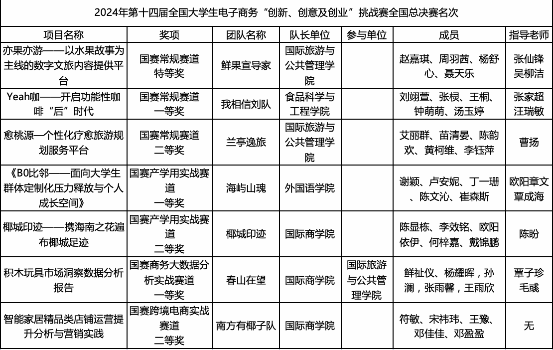 日前,第十四届全国老员工电子商务“创新、创意及创业”挑战赛全国总决赛(“三创赛”)圆满收官,本届赛事吸引了全国31个省、市(自治区)的近18万支团队报名参加,最终有232支团队入围常规赛道总决赛、82支团队入围跨境电商实战赛、120支团队入围产教融合实战赛、121支团队入围乡村振兴实战赛。伟德bv1946官网代表海南省遴选入围全国总决赛的7支团队全部荣获国家级奖项,分别荣获常规赛全国总决赛特等奖1项、一等奖1项、二等奖1项,商务大数据分析实战赛全国总决赛一等奖1项,产学用(BUC)实战赛全国总决赛一等奖1项、二等奖1项,跨境电商实战赛全国总决赛二等奖1项。获奖总数和最好名次均创造了公司参加此项比赛以来的最好成绩。