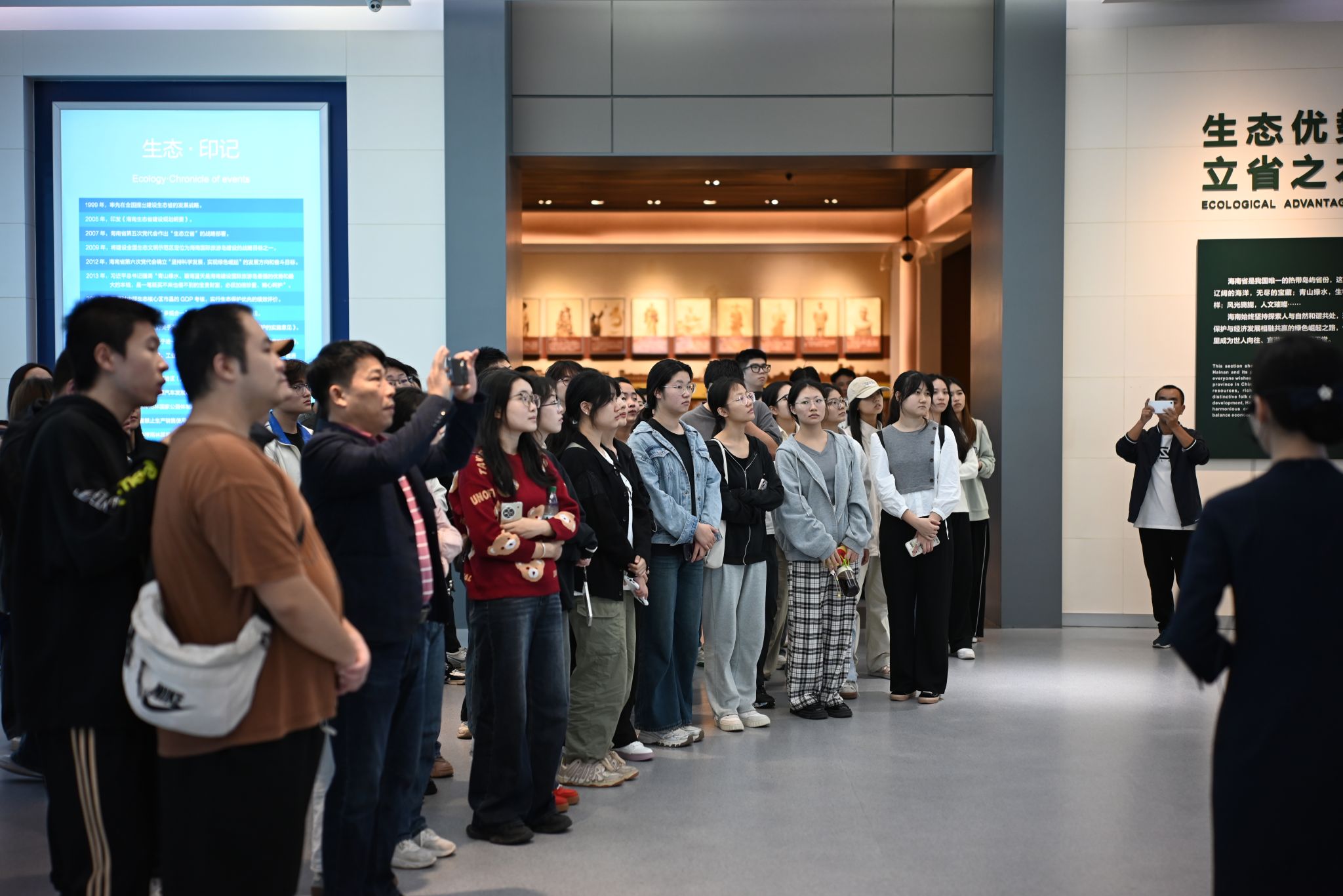 随后,师生们来到二楼,观看了海南省生态景观变化视频。视频中展示了海南丰富多样的生态景观,如热带雨林、广袤海洋等,以及随着时间推移这些景观所发生的变化,使员工们深刻认识到生态保护在城市规划中的重要性。接着,师生们参观了海南省规划的发展历程展示区,这里详细介绍了建省以来规划的发展变化,通过不同时期的规划方案对比,员工们清晰地看到海南城市规划如何随着时代发展、政策导向和社会需求而不断调整与完善。