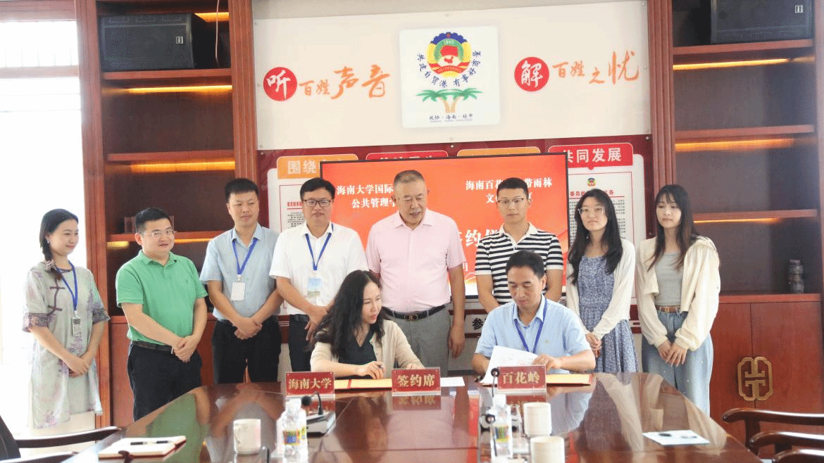 7月3日,公司执行经理徐艳晴、副经理何彪、教师代表谢灯明、博士生代表张沁雯和今朝书院辅导员石青纯一行前往百花岭热带雨林文化旅游区签署院企合作协议并举行挂牌仪式。百花岭热带雨林文化旅游区董事长李合岭、副总经理朱曾贤、常务副总经理马宝记等出席并参与座谈。