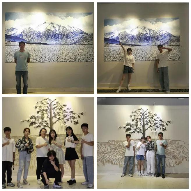 本次新疆棉主题展览活动介绍了新疆棉发展史、纺织业发展史、国棉联盟、棉花生长过程开始,展示了手工作品棉花树、众多有关棉的美术作品,并设置了互动区与连环画,这一系列的环节都旨在向观众科普新疆棉知识,展现新疆棉的独特魅力。展览中的雪山作品和栩栩如生的棉花树更是深受观众和老师同学们的喜爱,自然而然的形成打卡背景墙。展览的“眼”“言”、“研”、“延”、“颜”五个模块的创意分区、各部分相关文字内容策划、现场的投屏的棉农发展史视频宣传以及众多的奇思妙想的创意棉花手工DIY制品则是旅游公司18级、19级会展经济与管理专业同学合作完成的。此外,为了提升观众的体验感而特别开设的“盲盒”互动体验的环节也引来嘉宾和老师同学们的关注。