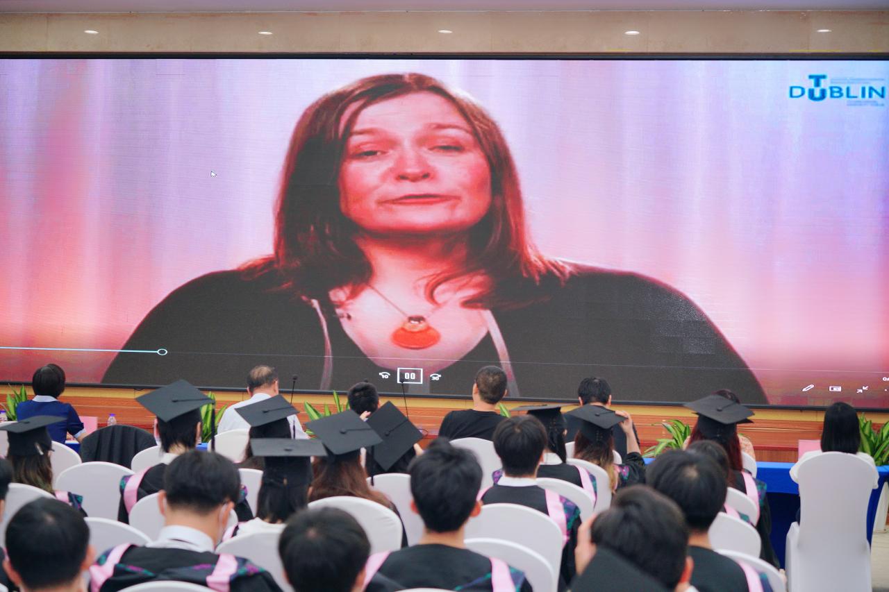 项目合作方代表爱尔兰都柏林理工大学(下称“外方”)酒店管理与旅游公司经理Orla McDonagh和副经理Ralf Burbach特地提前录制好祝福视频在典礼现场播放。他们表达了对中爱合作办学项目的肯定与支持,对毕业生们在未来献身于中国经济发展、会展产业进步表示了殷切的期待,并表示爱尔兰都柏林理工大学将永远以他们为傲。