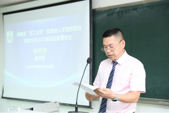 随后,海南文华旅业集团有限公司总裁麦伟文作为2021级新生代表进行发言。他说到“旺工淡学”旅游业人才培养项目已列入首批自贸港制度创新案例,他表示要本着终身学习的理念不断更新知识体系和专业技能。