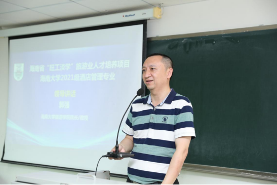 2021年3月28日,海南省“旺工淡学”旅游业人才培养项目伟德bv1946官网2021级酒店管理专业开学典礼(海口)在伟德bv1946官网旅游公司8号教学楼303项目专用教室举行。海南省旅文厅人才教育处处长李恩、海南省旅游协会秘书长廖小平、海南省旅游饭店业协会秘书长王德余、伟德bv1946官网旅游公司经理郭强、党委书记韩力光、副经理谢祥项、旅游公司客座教授陈耀,以及酒店管理专业系主任、专业负责人、“旺工淡学”项目办专员、师生代表等110多人参加本次开学典礼。活动由旅游公司副经理、项目联盟办公室主任谢祥项主持。
