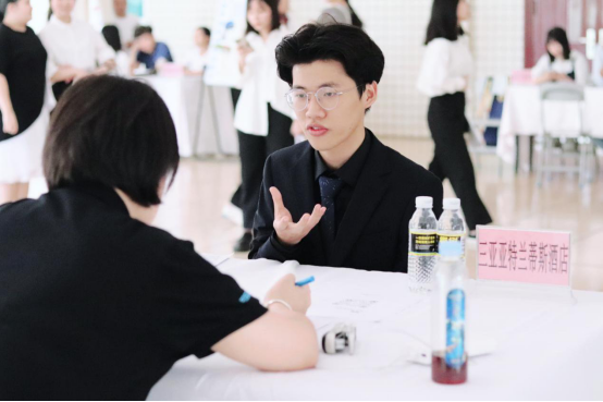 面试现场,同学们个个精神饱满、自信地回答面试官的问题,他们凭借四年学习所得向酒店方积极推介自己,展现自身专业水平和能力素质。