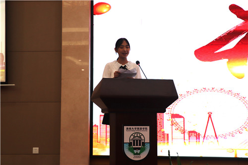 听完了前辈们的悉心教诲,新生代表19级旅管一班的张谈睿灵同学也代表新生描述了自己刚进入大学的心绪以及对未来的信心和展望。