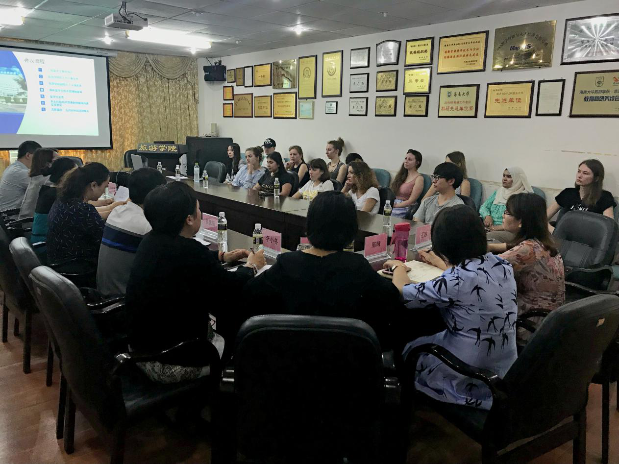 王永强副经理介绍了“一带一路”倡议、“双一流”建设背景下旅游公司旅游高等教育国际化的发展目标,并就公司国际化发展战略及发展方向作了详细介绍。他指出旅游是经济活动,更是社会文化活动。国家职工在海大读书期间,是人生当中一段难忘的岁月。国际职工不仅代表着个人,也代表了一个国家,是中西方文明的传播者、中国与相关国家的友谊使者。他向职工提出了“四个热爱”的期望和要求,热爱旅院、热爱海大、热爱海南、热爱中国,希望国际职工在认真学习的基础上,积极参与社会服务,促进双方国家的友好关系,并协助公司一起做好国际化发展战略和跨境旅游教育项目。
