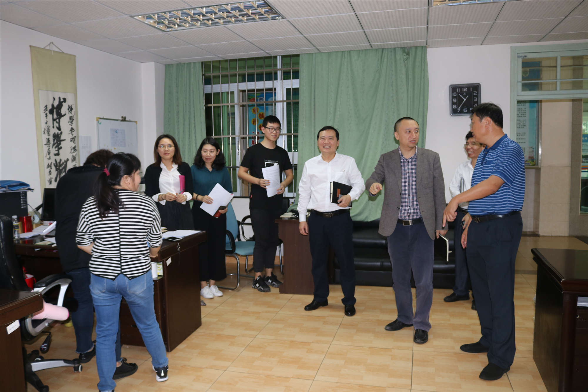 检查组一行先后重点检查了各办公室、中爱项目办公区、实验室、资料室、试卷库等场所设施安全和办公环境情况,并听取了相关责任人的工作汇报。