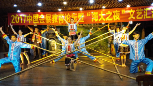 夜幕降临,来自全国各地的会展教师齐聚一堂,观看“海大之夜”文艺演出,演出汇聚海南民俗歌舞,听到持杆者高声呼喝出“嘿,呵嘿”也纷纷参与其中,跟随舞者灵巧地跳起竹竿舞,每次机灵敏捷地跳出竹竿,参与者都会露出得意的笑容,晚会现场气氛热烈,与会嘉宾热情高涨,盛情一片,其乐融融,展现会展人特有的豪迈洒脱情怀。晚会现场还有儋州调声、等展现了海南特有的文化表演,“这真是一场豪华的民俗盛宴,领略了好一番海南地方特色民俗风情。