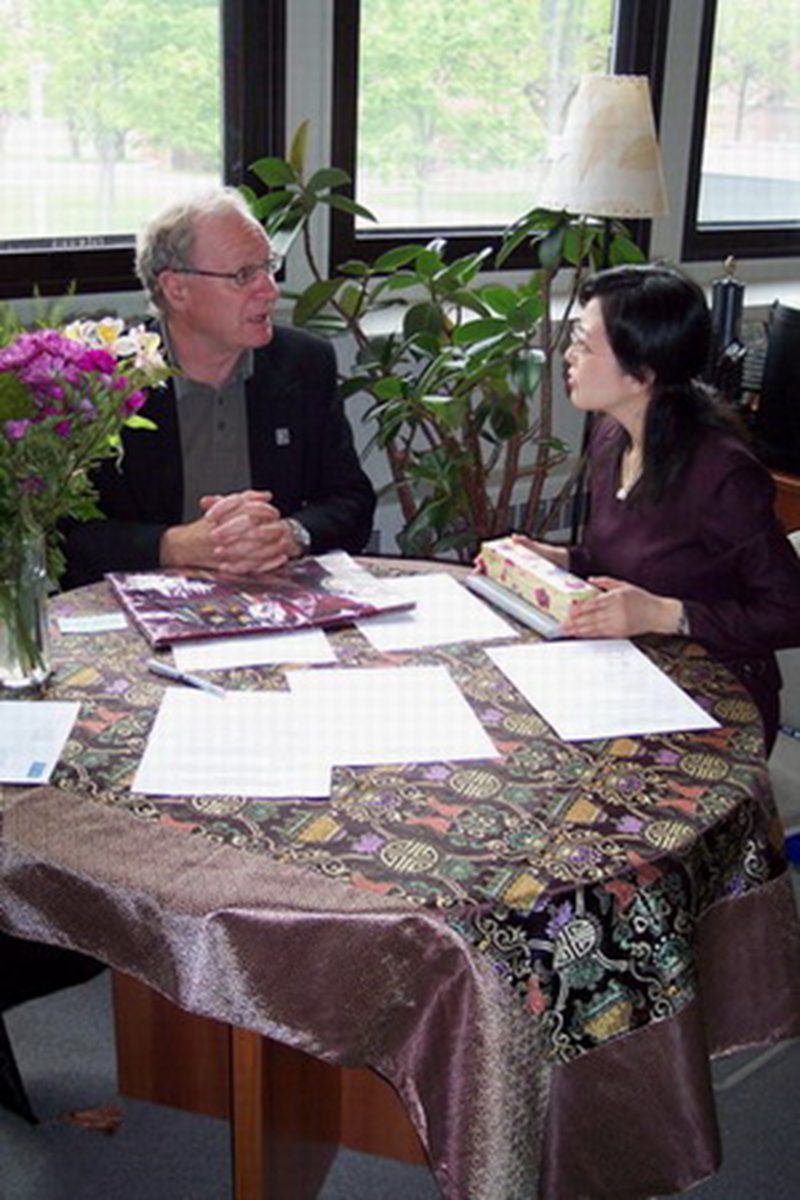 加拿大爱德华王子岛大学韦德董事长(左一)与杨红老师亲切会谈