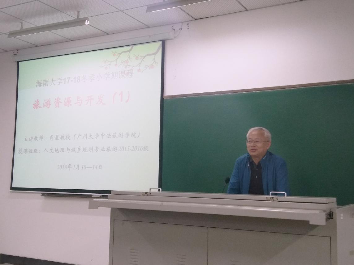 本次讲座,肖星教授主讲课程为《旅游资源与开发》,他结合自己30多年来对旅游资源开发与规划的倾心研究,以亲手拍摄的大量中外旅游资源精美图片为切入点,通过深入浅出的理论阐释和精彩生动的案例分析,向同学们系统讲述了旅游资源的类型评价、开发规划、利用保护等理论知识。与此同时,肖星教授还向同学们讲授做人和做学问的道理,鼓励大家刻苦学习专业知识,多方开拓专业视野,全面提升自己的综合素养,更好地服务于海南国际旅游岛和全域旅游示范省建设。