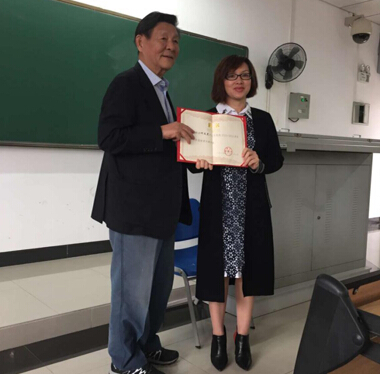 韦开蕾经理(右)为叶文虎教授(左)颁发冬季小学期外聘专家聘书