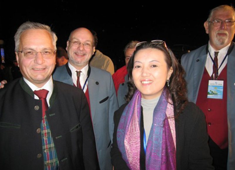 (从左至右:奥地利宫堡茨克尔亨市市长费尔帝南德·库克;奥地利宫堡茨克尔亨男子合唱团团长迪特·约翰内斯;伟德bv1946官网旅游公司老师段淳淳)
