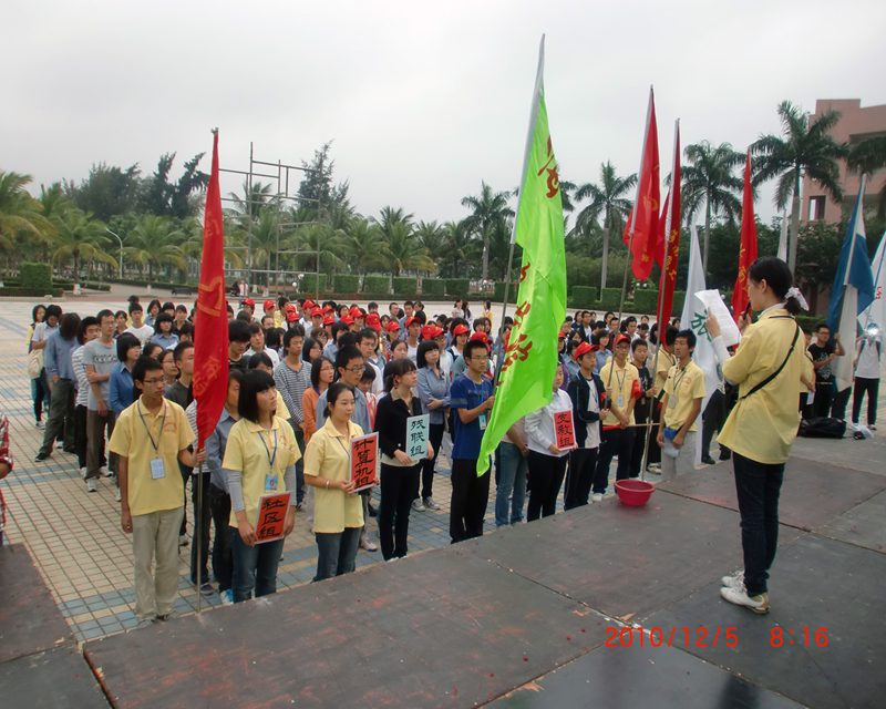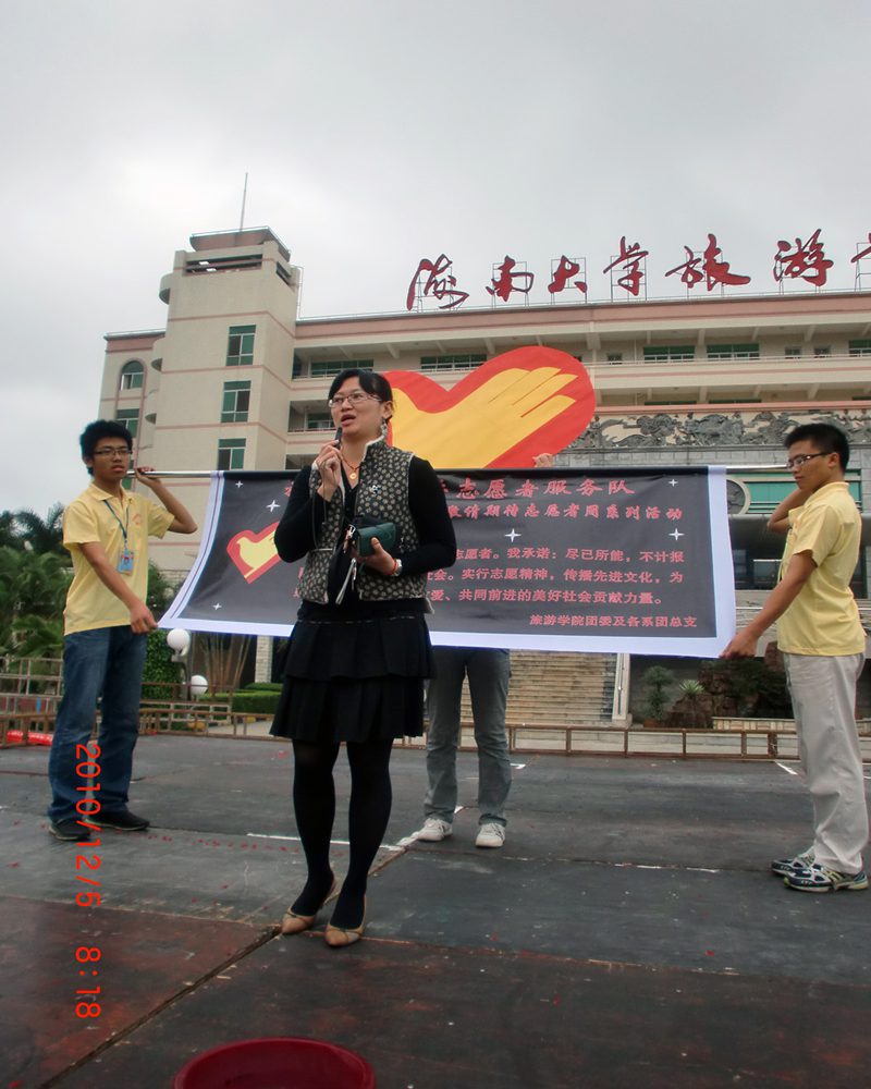 2010年12月5日是国际志愿者日。在今天这重大的日子里,由旅游公司团委实践部组织的伟德bv1946官网旅游公司团委志愿者活动周启动仪式暨誓师大会于今天上午在旅游公司三教广场正式开始。参与此次誓师大会的有旅游公司市场营销系辅导员林春梅老师、旅游公司志愿小组成员、院际交流志愿者小组的同学以及旅游公司团委成员。