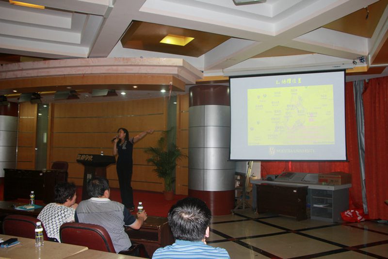 讲座的第一个环节,由邱滢博士对霍夫斯特拉大学进行简单而全面的介绍。除了众员工最关心的费用以及可选科目以外,邱滢用PPT以及一个八分钟的视频介绍了霍夫斯特拉大学的校园环境、校园内的社团活动、校园内各个功能区的分布、公司强力推荐的几个可持续发展的科目以及其他热门的可选的科目、公司的优越的地理位置、公司的简史以及公司的教学优势。