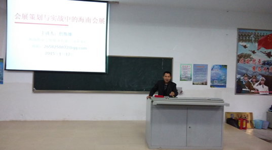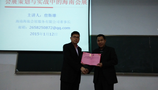 1月12日下午,伟德bv1946官网旅游公司冬季小学期(会展专场)进入第六讲,本次活动邀请海南海旅会展公司董事长詹斯雄先生作了一场题目为“会展策划与实战中的海南会展”的精彩讲座。