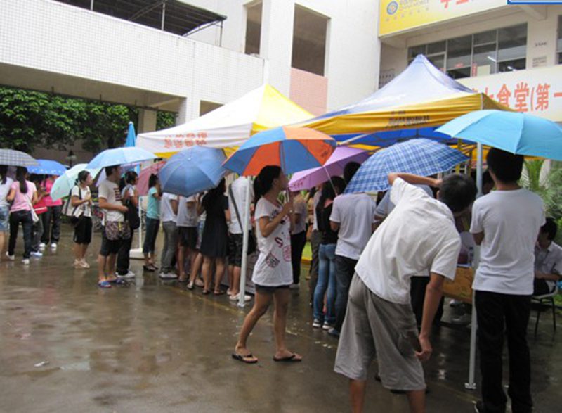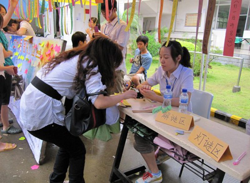 中秋灯谜会的场地设在旅游公司的一号食堂门口,帐篷内五彩灯谜卡纸高挂,仿佛向人们昭示着节日的来临。帐篷前的中秋心愿版也是吸引大家的眼球。灯谜会现场参与者积极、踊跃,无论是大一新来的同学还是已经在校度过中秋的同学,无不兴趣盎然。你看:猜谜者,眉目紧锁,苦思冥想;猜中者,兴奋异常、欢呼雀跃,甚至击掌庆贺,不为这小小的奖品,只为这小小的成就感;未猜中者,扼腕长叹,再次陷入了深思。工作人员也是忙的不可开支,这边忙着给答题者核对答案,这边忙着给猜中者兑换奖品,另一边更是忙着给对思乡的学子递上心愿条,让他们写下句句对家人的思念的话语。每个人都沉浸在活动的氛围中,尽管天还下着雨。