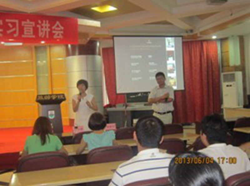 2013年6月4号下午2点50分,旅游公司在2教多功能厅召开了2011级酒店管理专业实习宣讲会,到场的嘉宾有三亚万豪酒店和瑞吉酒店的人事部负责人、旅游公司副经理胡涛和孙建军出席,会议由谢祥项老师主持。