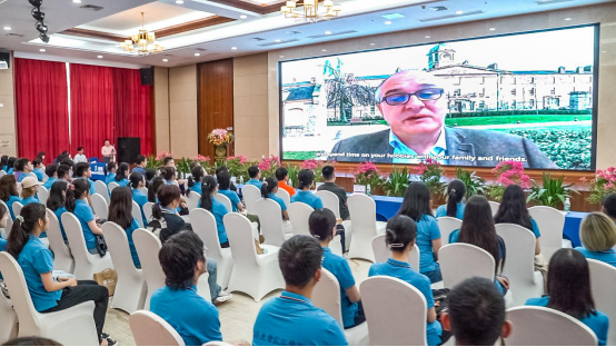 随后在会议上播放来自爱尔兰的祝福,都柏林理工大学(简称“爱方”)的副董事长兼国际合作交流处处长Robert Flood和酒店管理与旅游公司副经理Ralf Burbach分别为新生精心录制开学寄语。先是表达了受疫情影响而不能到场与会的遗憾,接着分别从公司、公司等不同角度介绍爱方公司与公司概况、以及项目的优势资源,希望新生能够充分利用大学时光,充分储备会展行业知识,以便迎接未来职业的挑战。