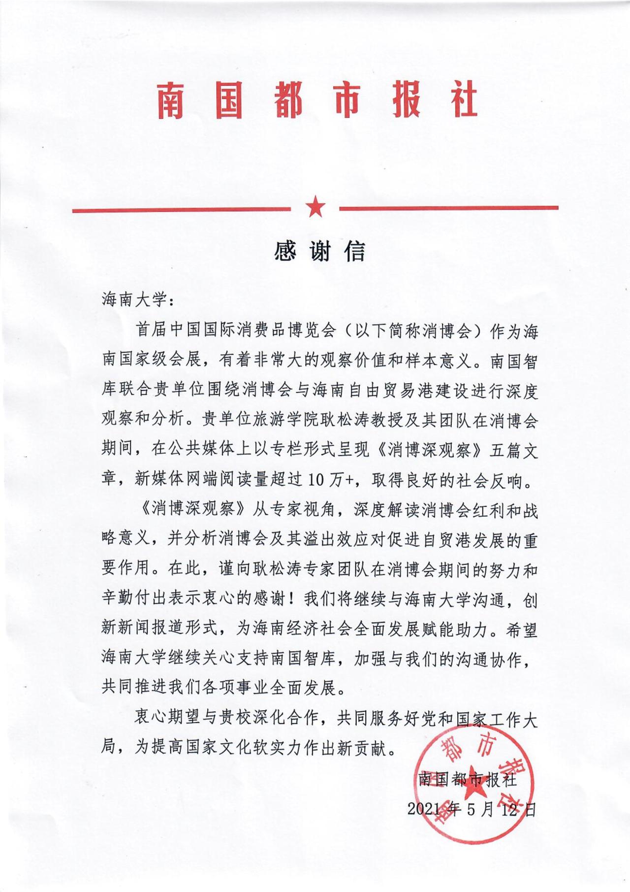 南国都市报社给公司耿松涛教授团队的感谢信