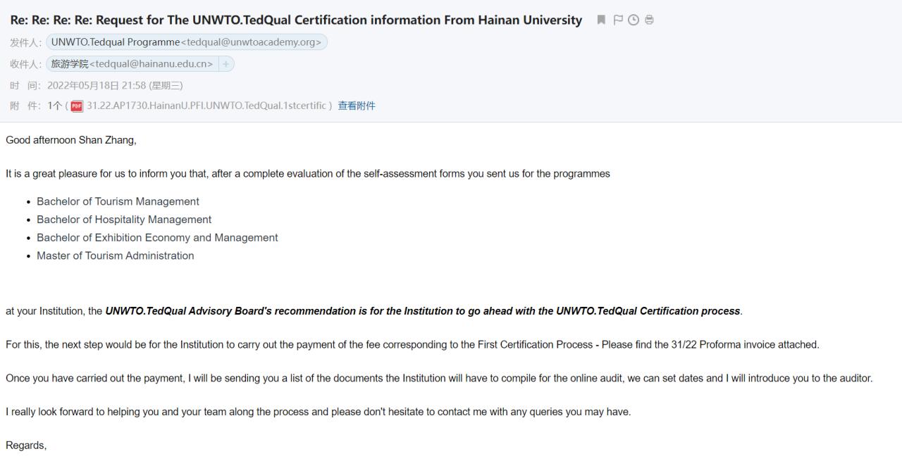 2022年5月18日,公司收到来自联合国世界旅游组织旅游教育质量认证机构(UNWTO TedQual)邮件通知:目前联合国世界旅游组织认证中心已通过了公司提交的旅游管理、酒店管理、会展经济与管理及旅游管理硕士四个专业的自评报告,认证工作取得了阶段性成果。