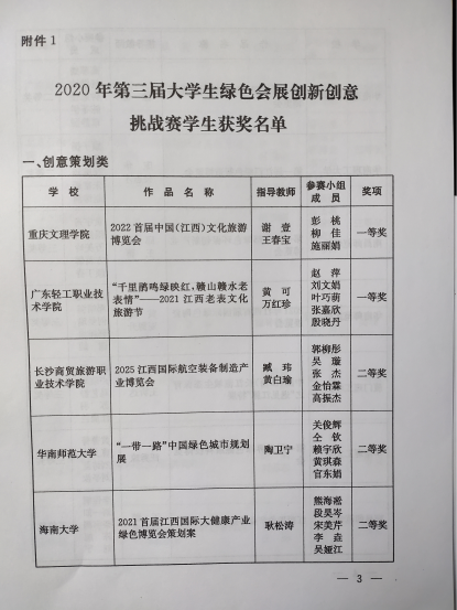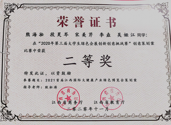 日前,由江西省教育厅、江西省商务厅主办的“第三届老员工绿色会展创新创意挑战赛”在南昌隆重举行。由公司耿松涛教授带队指导,2018级会展经济与管理专业熊海凇、段昊岑、宋美芹、吴娅江、李垚五名同学组成的伟德bv1946官网旅游公司代表队以总成绩第五名,荣获比赛二等奖。