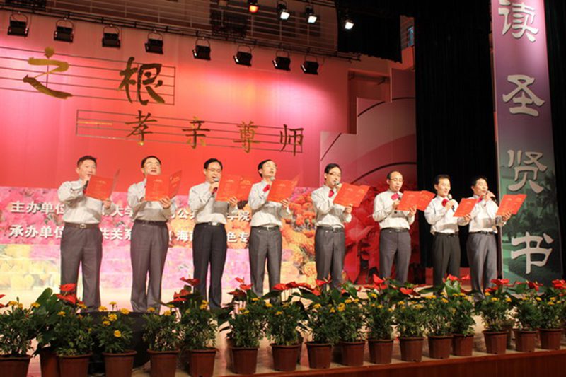 为紧扣伟德bv1946官网“校园文化建设年”这一主题,树立特色鲜明的优良校风,打造先进的校园文化品牌,政治与公共管理公司于5月13日“母亲节”之夜,在思源学堂成功举办“徳之根——孝亲尊师”朗诵演唱晚会。公司党委书记刘康德,副董事长刁晓平、何忠平、傅国华,部分机关部门负责人和近千名师生观看了演出。