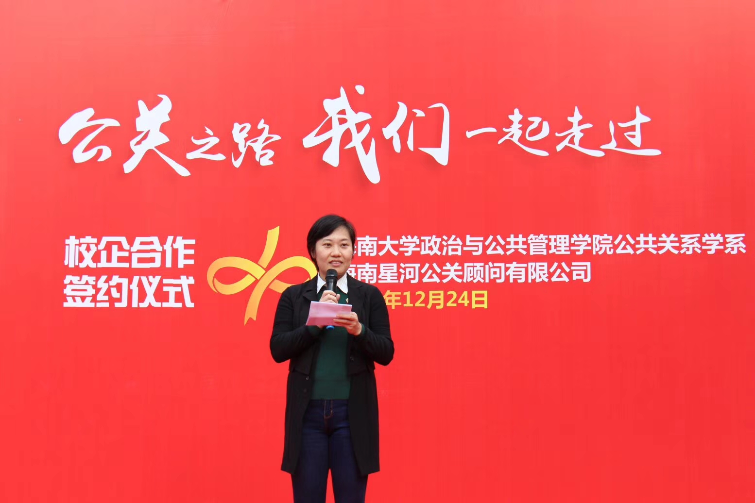 12月24日上午,政管公司公共关系学系公关一家亲——公共关系学专业新老生见面会暨院企合作签字仪式”在伟德bv1946官网社科楼广场成功举办。出席活动的嘉宾有星河公关郭海霞执行董事长郝剑民总裁、刘倩董事,政管公司邢红斌副书记,系主任陈小桃、毕研韬、汪浩教授,郑崇明、王芳、黄燕梅副教授,15、16级公共关系学专业全体同学和17级公共管理学科部分同学。