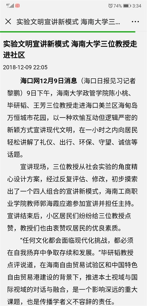 本次公益宣讲由美兰区人民街道办事处与伟德bv1946官网政治与公共管理公司自贸区自贸港建设与政府公关研究中心、海南博睿公共关系研究中心国际公关联盟联合主办。据了解,本次宣讲模式将在进一步总结完善后在更多社区推广。(《海口网》2018年12月9日有报道)